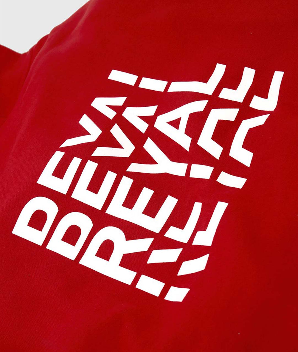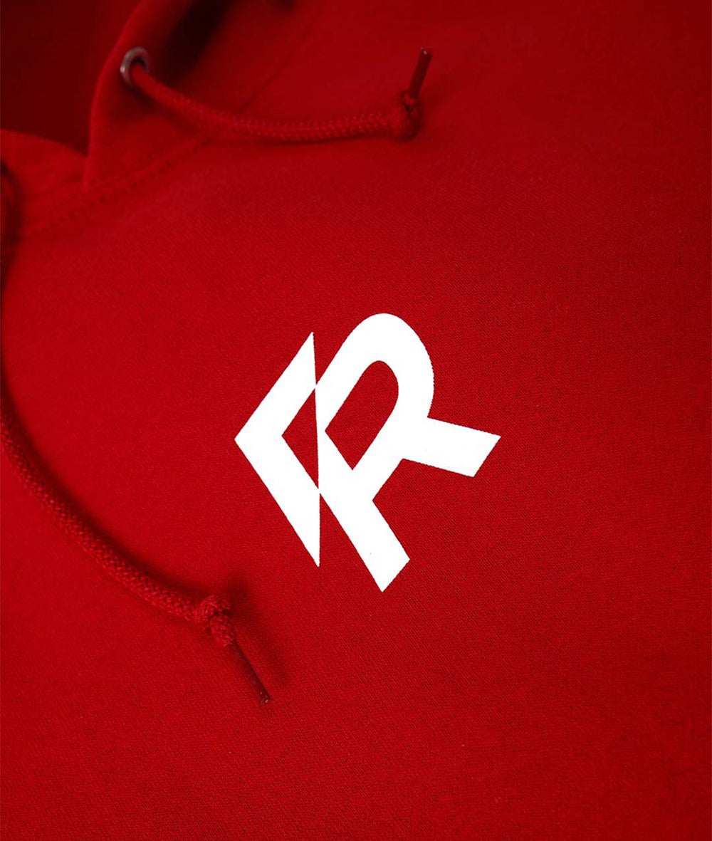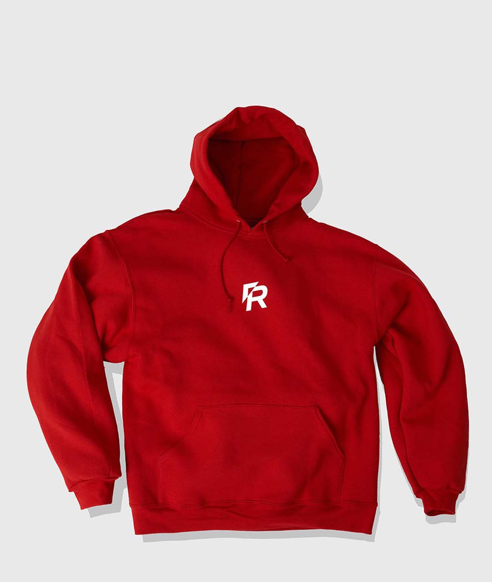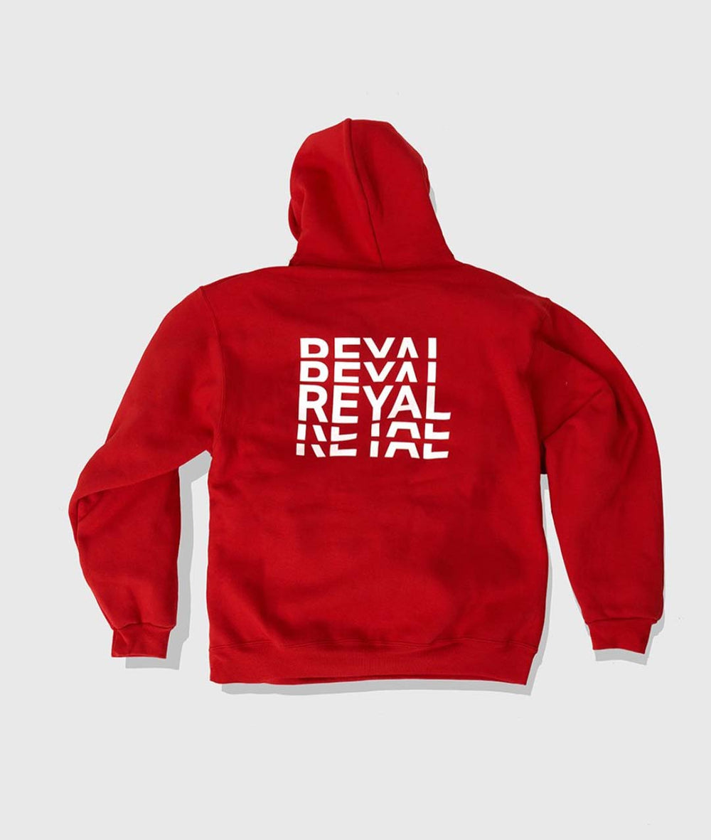 The REYAL Stacked Hoodie in red with white stacked graphic. A pre-pump staple for you to wear to and from the gym.